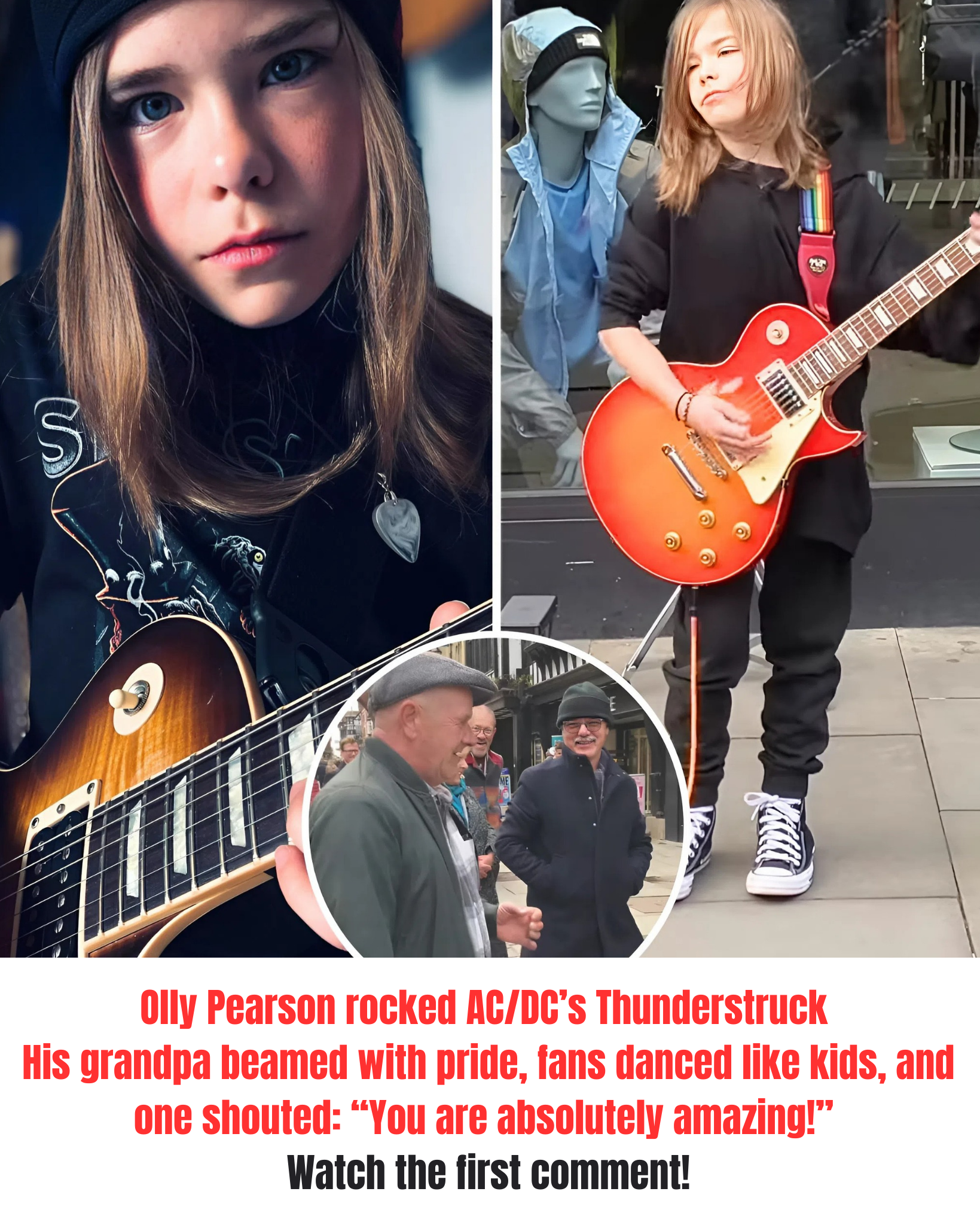 Performing on a bustling corner, the young guitarist’s fingers flew over the fretboard with astonishing precision, delivering one of rock’s most technically demanding riffs with flair and confidence. Among the crowd, his grandpa beamed with pride, while another older man danced like a carefree child. As the final notes rang out, a bystander approached Olly, declaring, “You are absolutely amazing.”