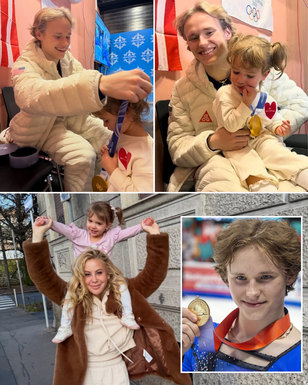 In the first photo, Malinin could be seen gently placing his gold medal over Georgie’s head. The little one reached out to hands to grasp the necklace, and then rested on the figure skater’s lap for a few sweet snaps.