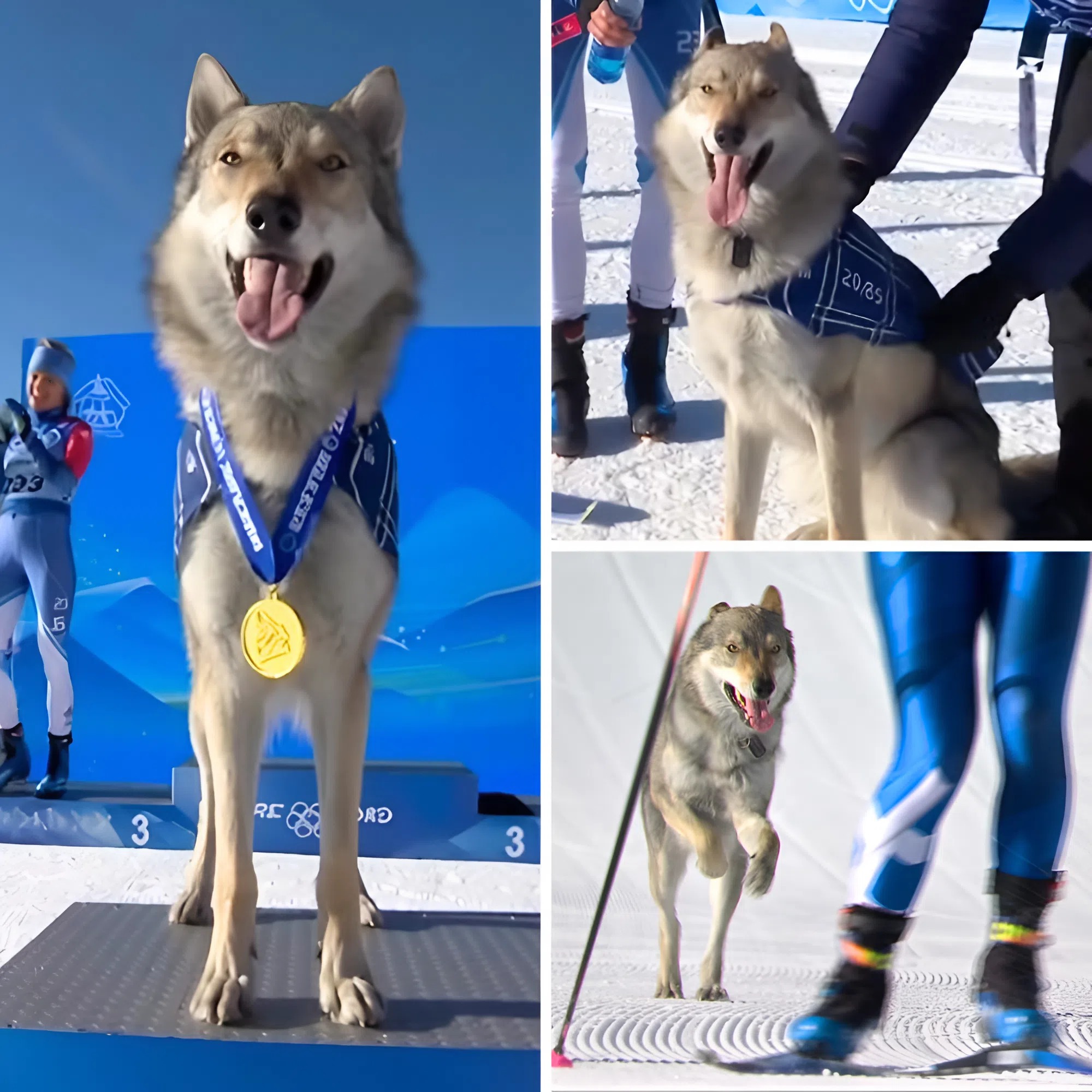 Suddenly a large, wolf-like dog appeared on the track, investigating a trackside camera before taking off after two skiers.