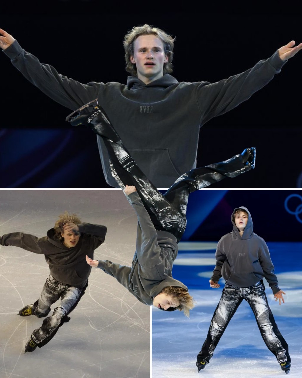 Dressed in a grey hoodie with the word “Fear” printed upside down and frayed jeans, Malinin didn’t start with a jump. He started with a flinch.